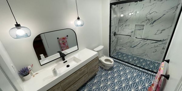 Here is a before and after picture of a bathroom that was outdated and the owner wanted something that would fit their kids a little better and was also able to grow with them. They decided to put in a small toilet and install a floating vanity a little lower, so the kids would have an easier time washing and brushing their teeth. In doing so, they will be able to adjust the height of the vanity fairly easily as they continue to grow. I tore out everything from the old tub to the tile and vanity. The client picked a beautiful tile for both the bathroom floor and the shower. The look on the little girl's face when she first saw her new bathroom was priceless!